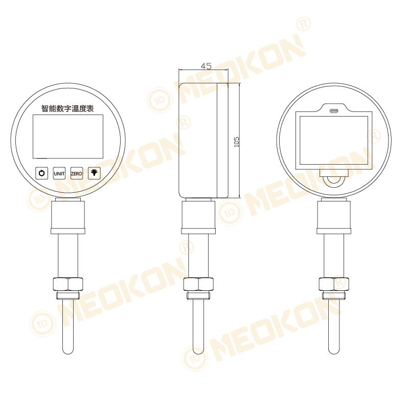 100mm超大表盤(pán),55x55mm超大液晶5位顯示,溫度精度高,低電報(bào)警、單位切換等多種輔助功能,探頭長(zhǎng)度及螺紋,溫度量程可定制